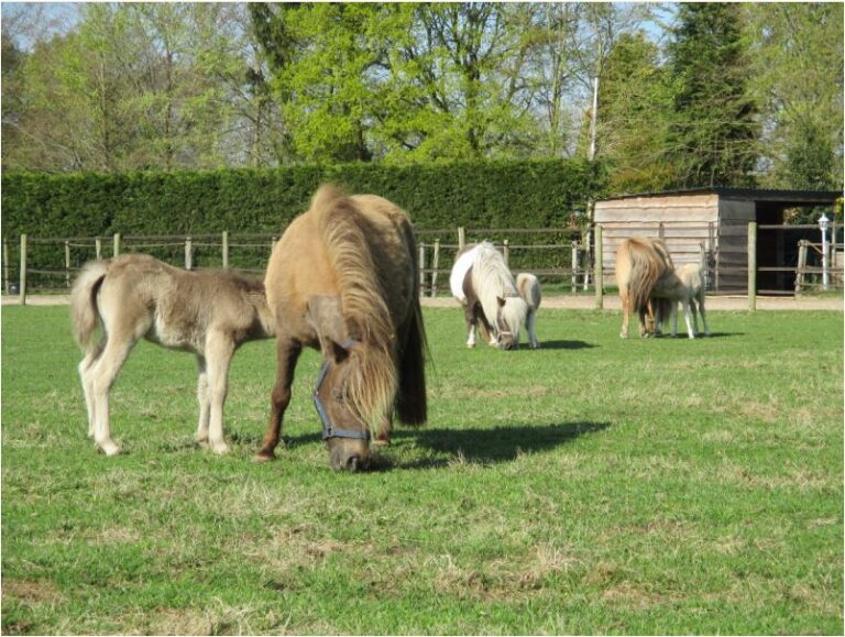 In het weiland naast de camping vind je minipaarden met in de juiste periode ook veulens.