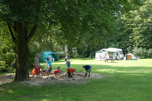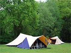 Door hoge bomen omzoomde kampeerweiden beschut door houtsingels en bosschages voor tenten en toercaravans. Ruime staanplaatsen. Voor houders van de natuurkampeerkaart een apart terrein.