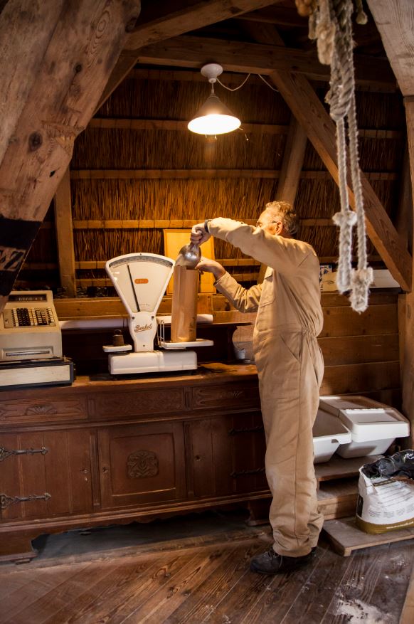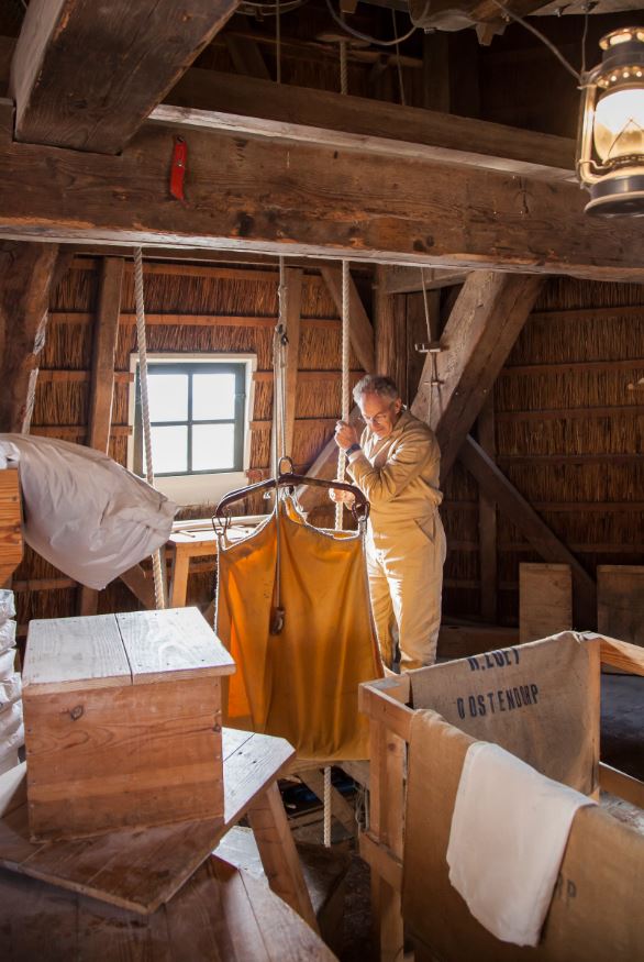 In de molenbakkerij, komen verschillende vakgebieden samen: een prachtige bakkerswinkel waar het brood en het gebak heerlijk geurend op zijn nieuwe eigenaar ligt te wachten, dan de kleine ijsfabriek waar alles puur en eerlijk wordt bereid, de desembakkerij en de chocolaterie. In de voormalige graanschuur bevindt zich de winkel. Het unieke bakkerij concept wordt compleet door de sfeervolle brasserie met veranda en terras.