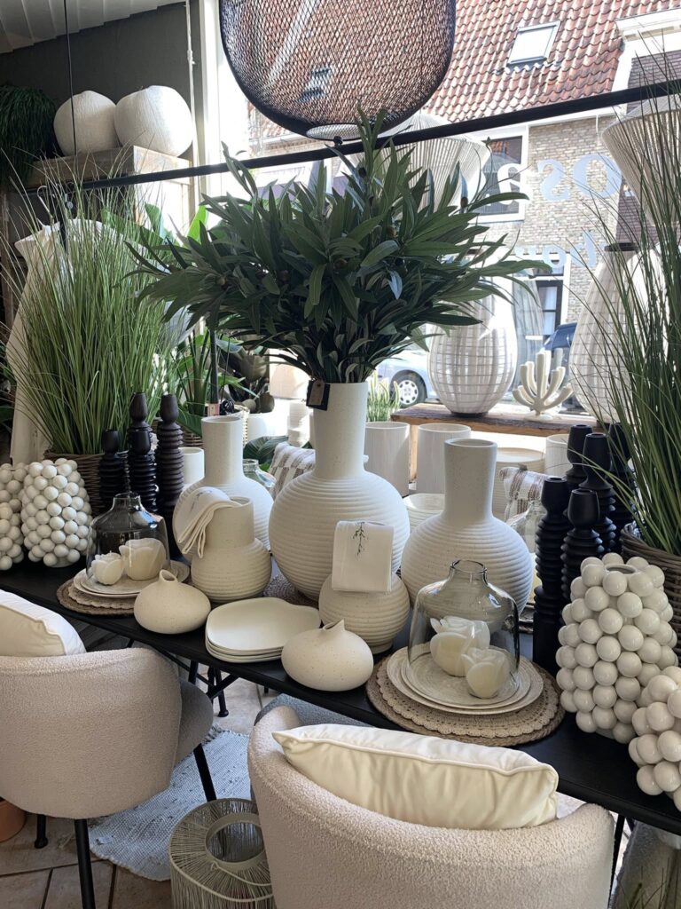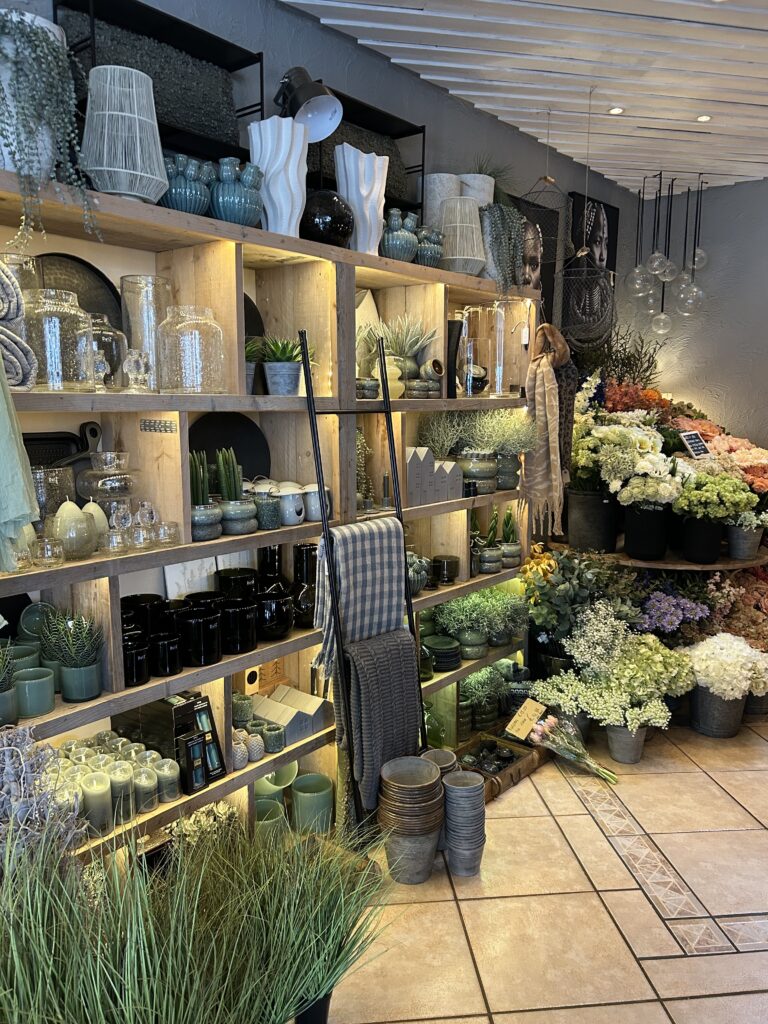 Hier vind je o.a. kaarsen, lampenkappen, luxe kussens, exclusief glaswerk, geurzakjes en geuroliën, mooie grote potten, sierlijke kunstbloemen en leuke meubeltjes. Ook zijn er regelmatig verse planten zo van de veiling!