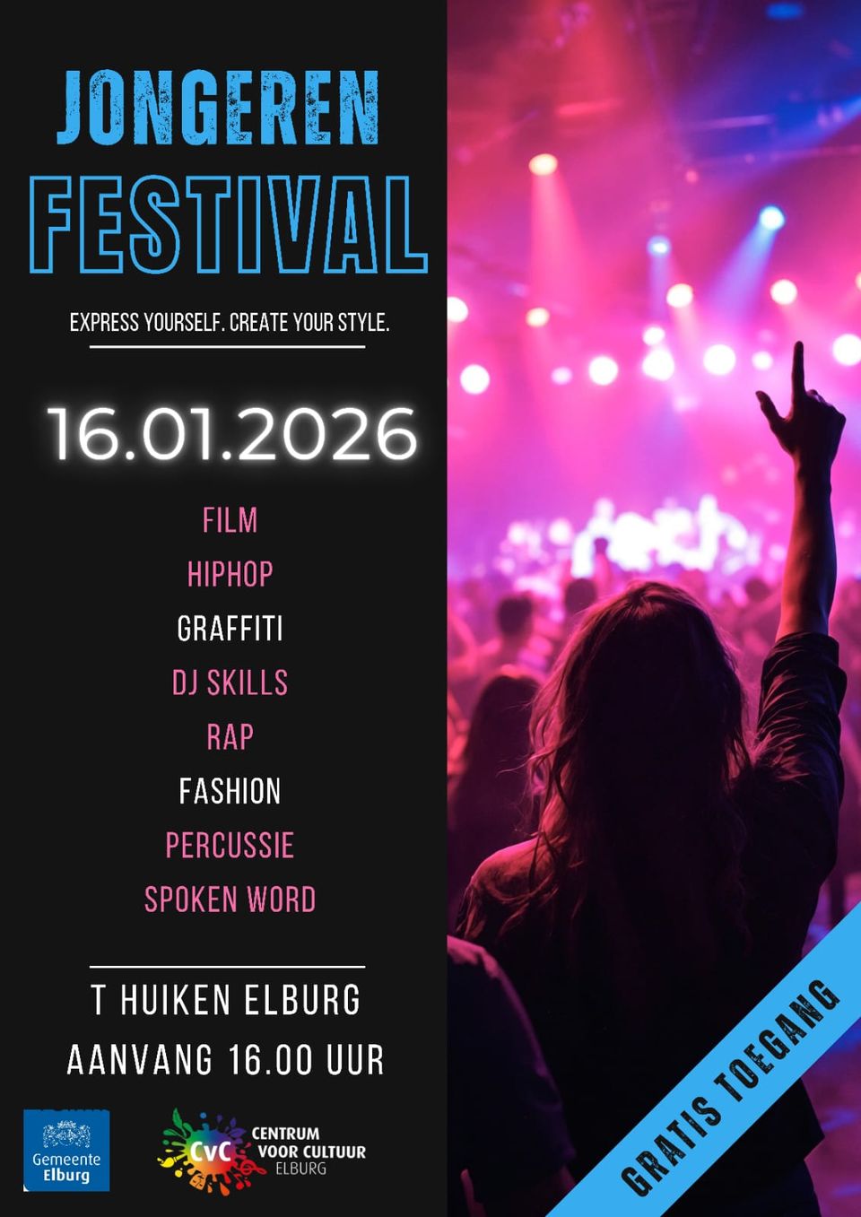 Op vrijdag 16 januari 2026 barst het jongerenfestival in Elburg los! Speciaal voor alle middelbare scholieren uit Elburg en de regio. Verwacht een dag vol energie, creativiteit en plezier waar jij het verschil maakt. Dit is het moment om samen los te gaan, nieuwe dingen te ontdekken en gewoon lekker te genieten met je vrienden.